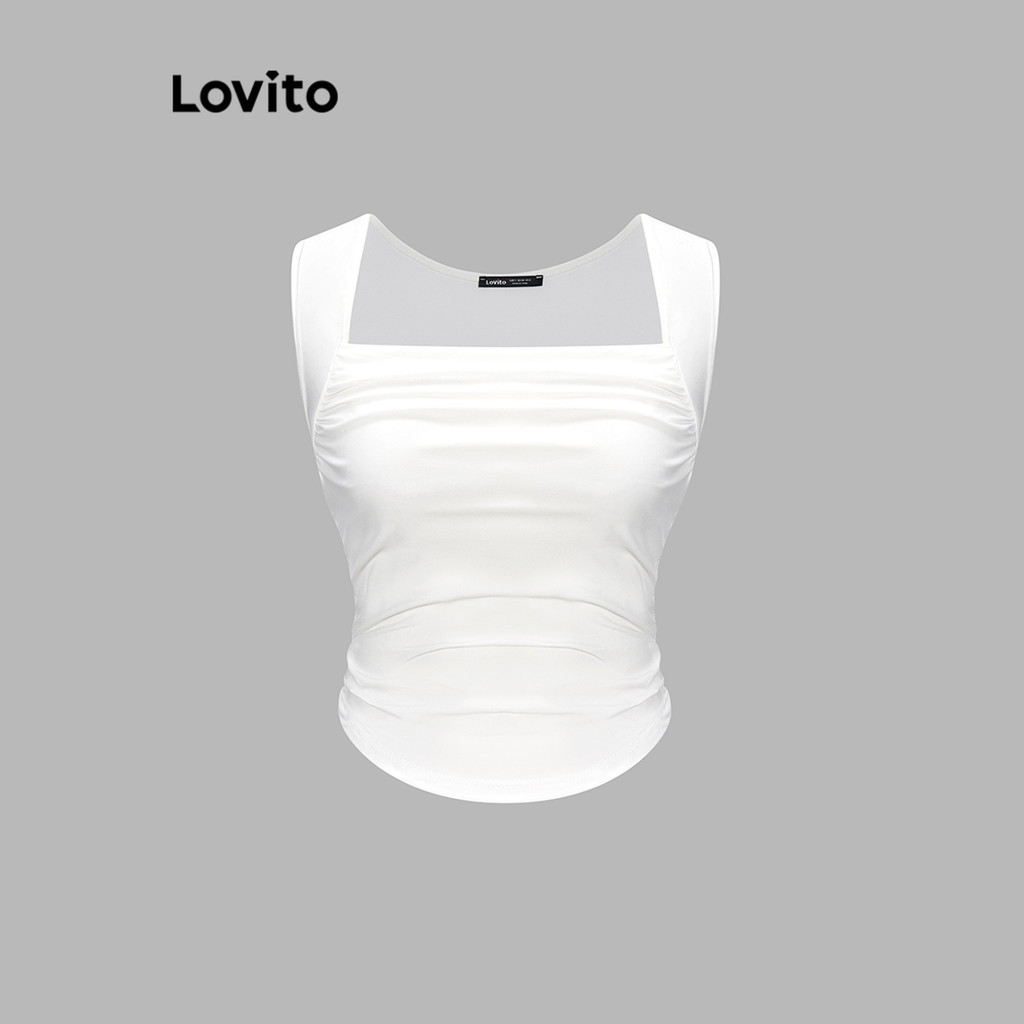 Lovito Casual Plain Ruched Hanky Hem Tank Top for Women L62ED045 (White/Black)